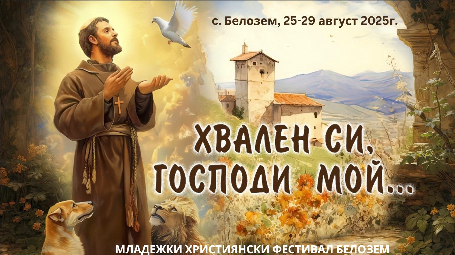 Традиционно последната седмица на месец август в Белозем братята капуцини оргазнизират Младежки фестивал. Тази година той ще се проведе под мотото „Хвален си, Господи мой…“ в дните от понеделник до петък, 25 – 29 август. Каним сърдечно младежи на възраст от 14 до 24 години да вземат участие. Започваме с участие в Светата литургия в Пловдив на 25 август /храмов празник на катедралата и благодарствена литургия за служението на монс. Георги в нашия диоцез/. След литургията ще има възможност за превоз от Пловдив директно към Белозем, а също може да се дойде и самостоятелно. Вдъхновени от призива на папа Лъв, отправен към младежите по време на срещата с тях в Рим: „Млади поклонници на надеждата, пазете приятелството си с Исус чрез молитвата, Евхаристията, изповедта и делата на милосърдие, следвайки примера на светците“, искаме да го реализираме и укрепим по време на тези фестивални дни. За записване и повече информация при брат Ярослав Бабик, тел. 0878 187 631