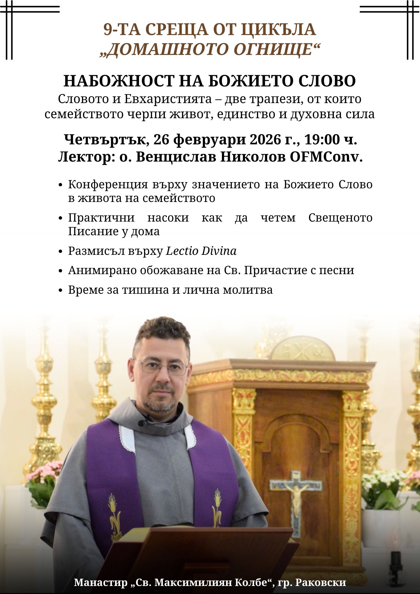 Деветата среща от цикъла „Домашното огнище“ ще бъде посветена на набожността към Божието Слово – извор на светлина, истина и сила за всяко християнско семейство.